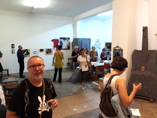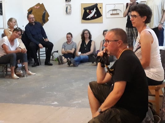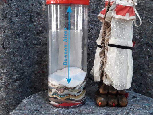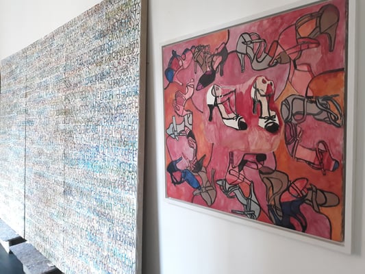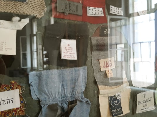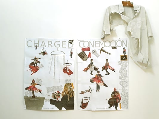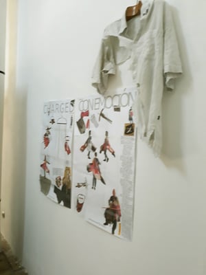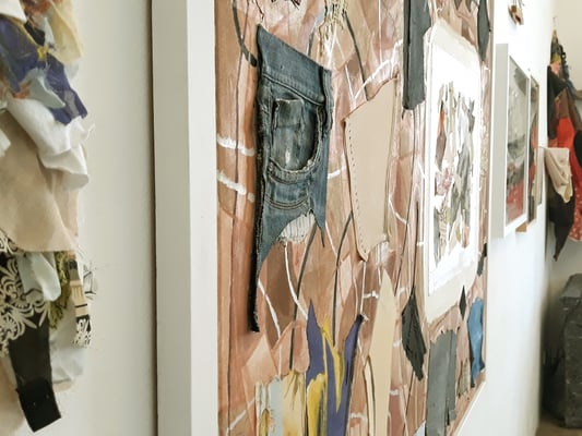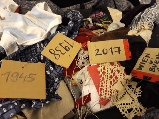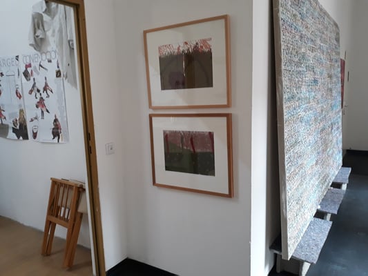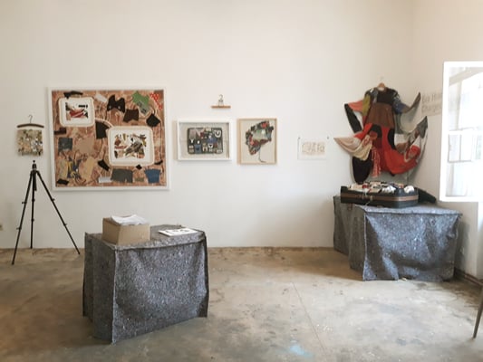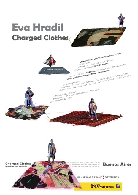 Eva Hradil war 2017 für ein Projekt in Buenos Aires. Die Arbeiten, die direkt dort entstanden sind und für die sie für die Ausstellung Rahmungen erfand und weitere, die danach mit dem mitgebrachten Material in Österreich dazukamen, der Katalog, der zum Projekt entwickelt wurde und die Reste der Kleidungsstücke waren im Atelier zu sehen.