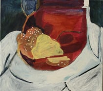 In dieser Hinsicht sind sicher auch die zwei so überdimensionalen Butterbrote in der Ausstellung zu sehen. Natürlich, der ironische, augenzwinkernde Aspekt ist unübersehbar, aber diese alleine wäre mir zu wenig. Mich interessiert dann schon, ob die Malerei hält. Denn solch eine große Fläche zu bewältigen braucht Mut und Könnerschaft. Für mich sind es einfache, wie gelungene Kompositionen, die ich wie abstrakte Bilder zu lesen versuche. Schön etwa die feine Kombination des kräftigen Rots der Marmelade, des gesprenkelten Grün des Schnittlauchs mit dem gelblichen Weiß der Butter...
